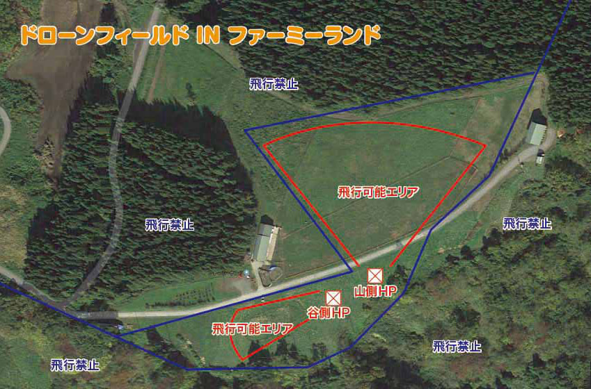 | 飛行コース | 谷側:離陸後、谷側に向かって飛行してください。 山側:離陸後、高度10mまで垂直に上昇し牧場側へ飛行してください。 ※ヘリポート南側の谷は飛行禁止です。万一の際、機体の捜索・回収ができません。 |